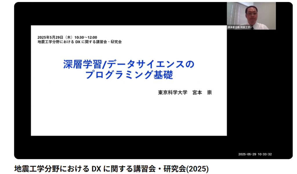 現在、デジタルトランスフォーメーション(DX)の推進がさまざまな分野で進められています。地震工学分野におけるDXに関する講習および話題提供を通じて、参加者の知見をさらに深めるとともに、研究者や技術者の交流を促進することを目的として、日本地震工学会は2025年5月29日に建築会館にて「地震工学分野におけるDXに関する講習会・研究会」を開催しました。当日は3名の講師をお招きし、演習を交えた講習会を実施し、多くの参加者の皆様にご好評をいただきました。